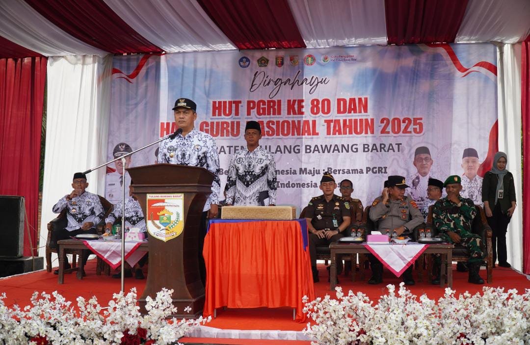 TubabaQu.id – Pemerintah Kabupaten Tulang Bawang Barat (Tubaba) menggelar Upacara Peringatan Hari Guru Nasional (HGN) ke-31 Tahun 2025 sekaligus Hari Ulang Tahun (HUT) Persatuan Guru Republik Indonesia (PGRI) ke-80 di Lapangan Marga Kencana, Kecamatan Tulang Bawang Udik, Selasa (25/11/25).