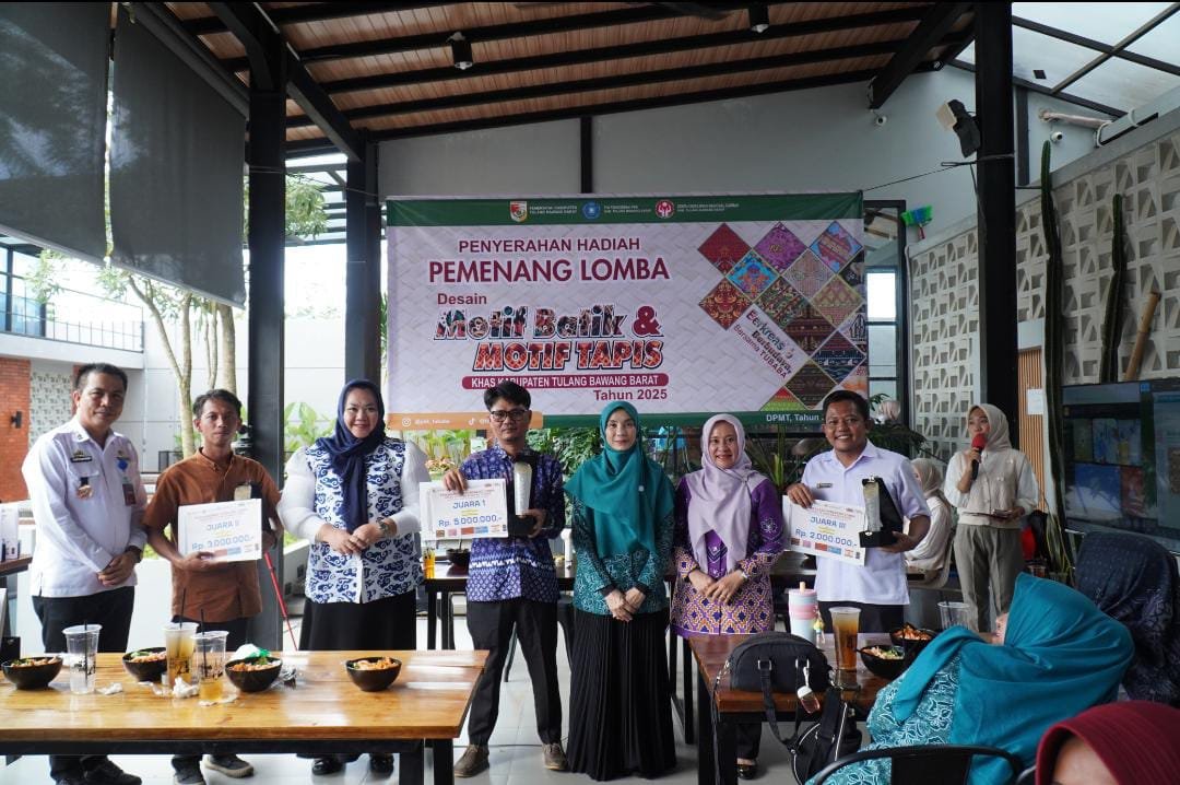 TubabaQu.id – Pemerintah Kabupaten Tulang Bawang Barat (Tubaba) melalui TP-PKK Tubaba bersama sejumlah dinas terkait melaksanakan puncak rangkaian kegiatan Lomba Desain Motif Batik dan Motif Tapis Tahun 2025 dengan agenda penyerahan hadiah kepada para pemenang. Acara tersebut berlangsung pada Rabu (26/11/2025) dan dipusatkan di Tasya Bakery & Resto.