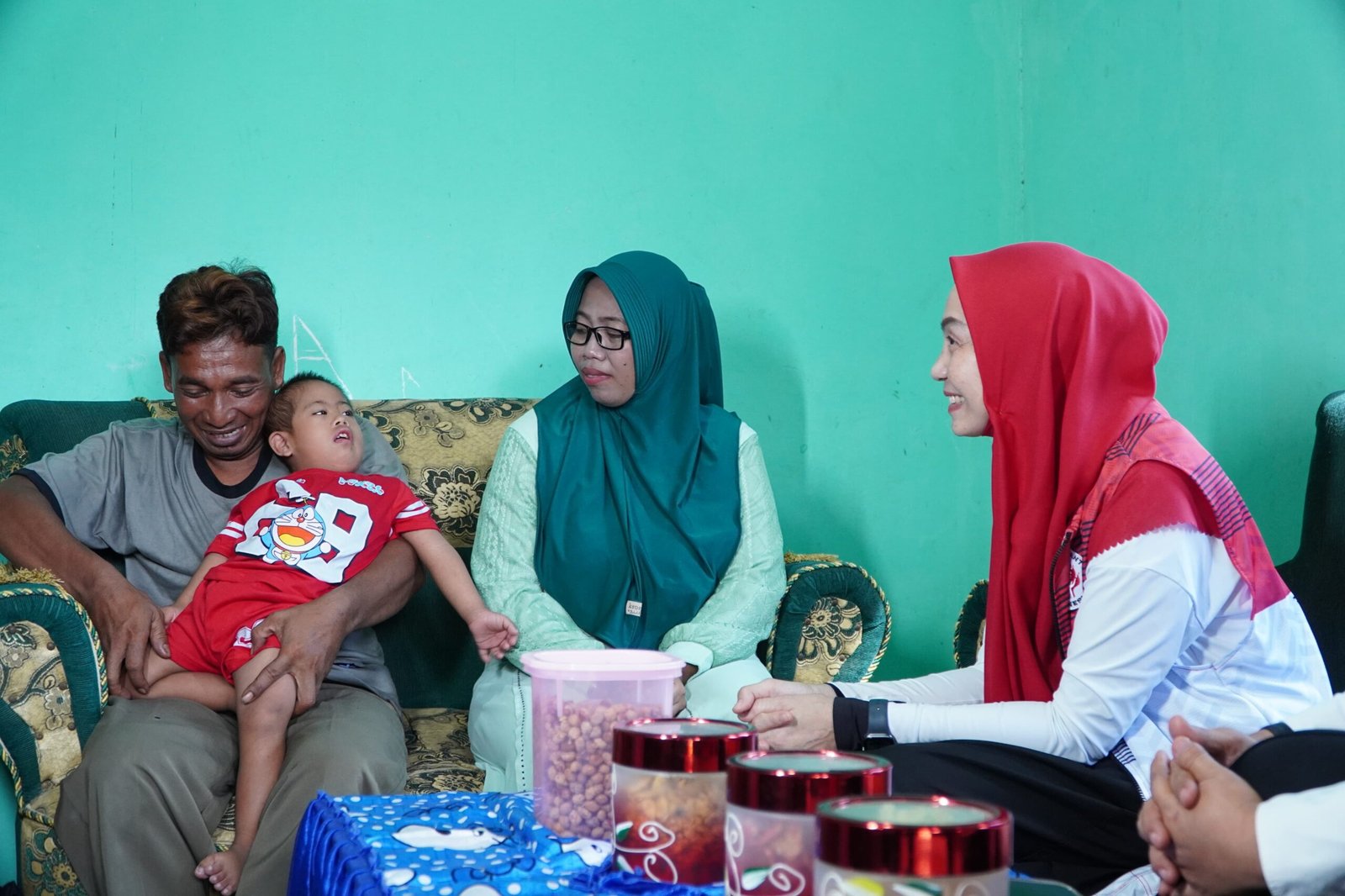 Ketua Yayasan Jantung Indonesia (YJI) Tubaba, Novianti Novriwan, bersama dinas terkait mengunjungi salah satu pasien Penyakit Jantung Bawaan (PJB), Faeyza Ma’arif (4), putra dari pasangan Soleh dan Eka Fitria, warga Tiyuh Kagungan Ratu, Kecamatan Tulang Bawang Udik.