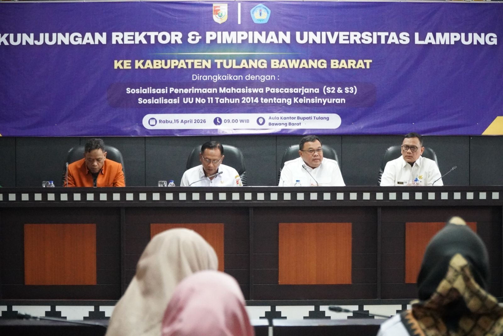 TubabaQu.Id – Pemerintah Kabupaten Tulang Bawang Barat (Tubaba) terus mendorong peningkatan kualitas sumber daya manusia (SDM) melalui penguatan kerja sama dengan perguruan tinggi. Hal ini ditandai dengan kunjungan Universitas Lampung (Unila) dalam rangka sosialisasi program pascasarjana serta pengenalan Undang-Undang Nomor 11 Tahun 2014 tentang Keinsinyuran, yang berlangsung di Ruang Rapat Bupati Tubaba, Rabu (15/04/2026).